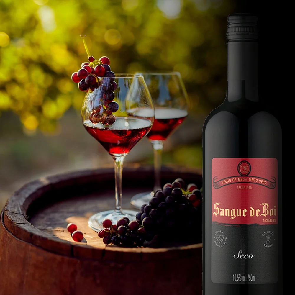 Vinho tinto seco, encorpado e intenso, com notas de frutas escuras. Ideal para carnes e queijos fortes.